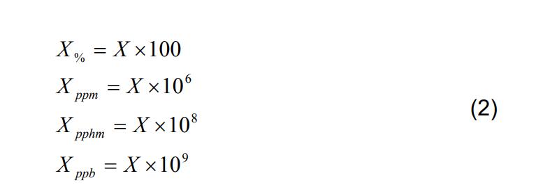 這通常是一個非常小的數(shù)字,因此混合比通常以百分比、百萬分之幾、億分之幾或十億分之幾(全部按體積,而不是質(zhì)量)表示,如下所示: